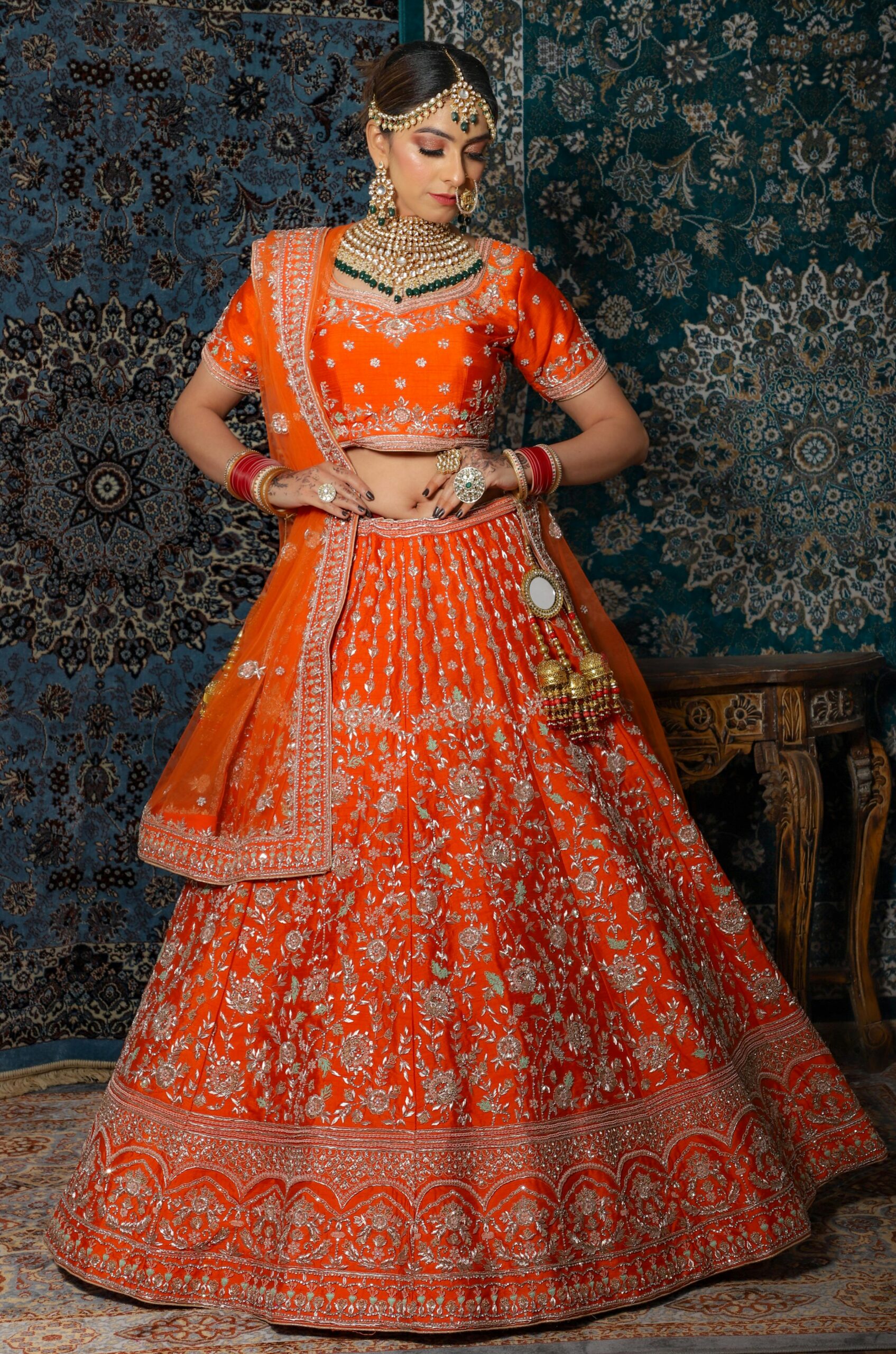 Celebrate tradition with this beautifully designed orange bridal lehenga, crafted in a luxurious silk blend fabric that offers both comfort and structure. The ensemble is adorned with heavy zari work embroidery, featuring intricate floral and ornamental patterns that reflect skilled craftsmanship. The vibrant orange color enhances the richness of the embroidery, creating a striking yet graceful bridal look. Designed with a well-balanced flare and detailed hemline, the lehenga drapes effortlessly while maintaining a regal silhouette.