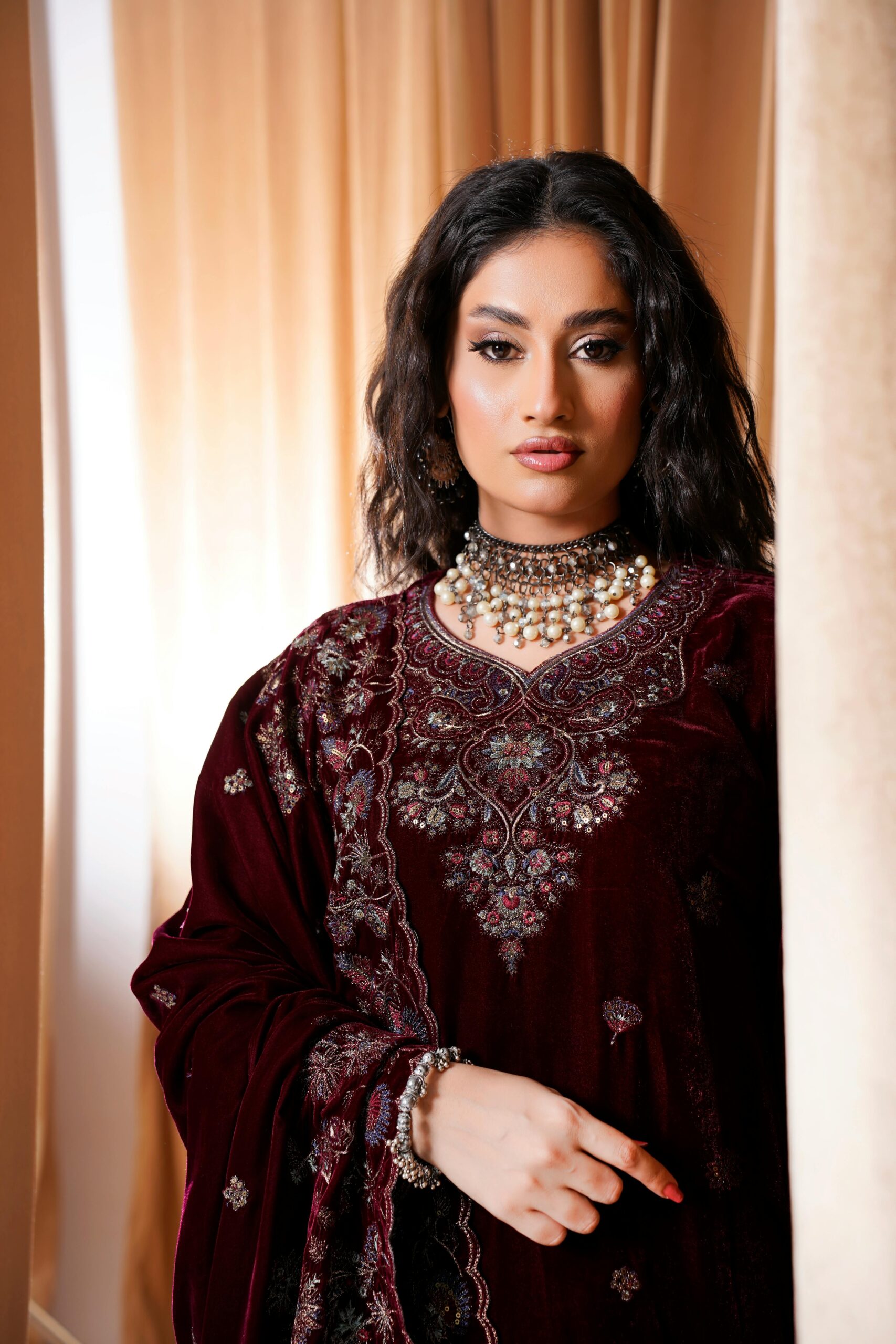 This red suit set is a refined choice for weddings, parties, and special occasions, designed to reflect traditional elegance through quality craftsmanship. Made from a high-quality silk blend fabric, the outfit offers a smooth texture, comfortable wear, and a graceful fall. The suit is adorned with intricate zari work embroidery in maroon and red tones, creating a rich layered look that enhances its festive appeal. The deep red base lends a classic and ceremonial charm, making it suitable for both daytime and evening events.